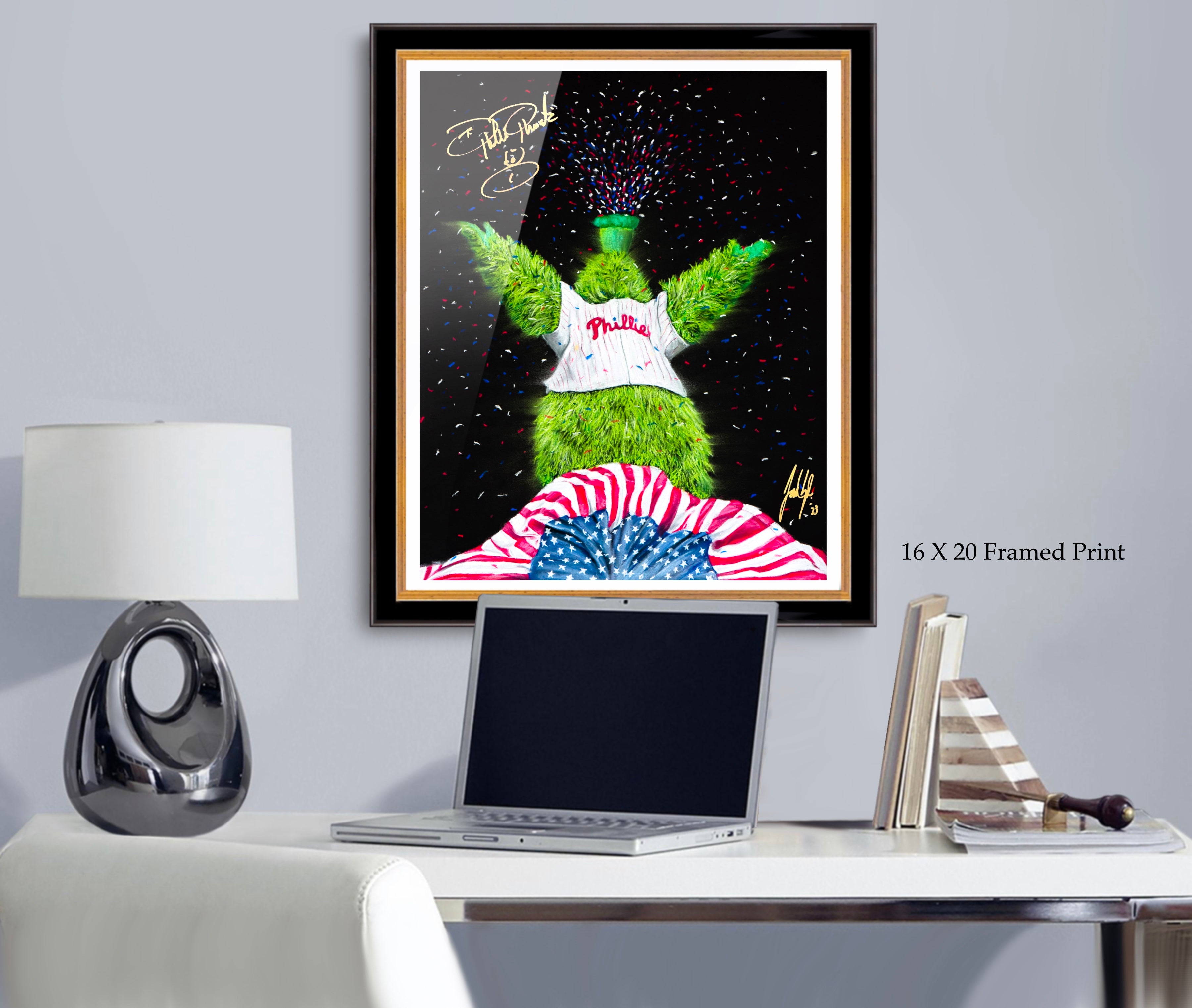 Each print includes an autograph from the current Phillies Phanatic (Tom Burgoyne), artist Jordan Spector, and a Spector Sports Art certificate of authenticity.