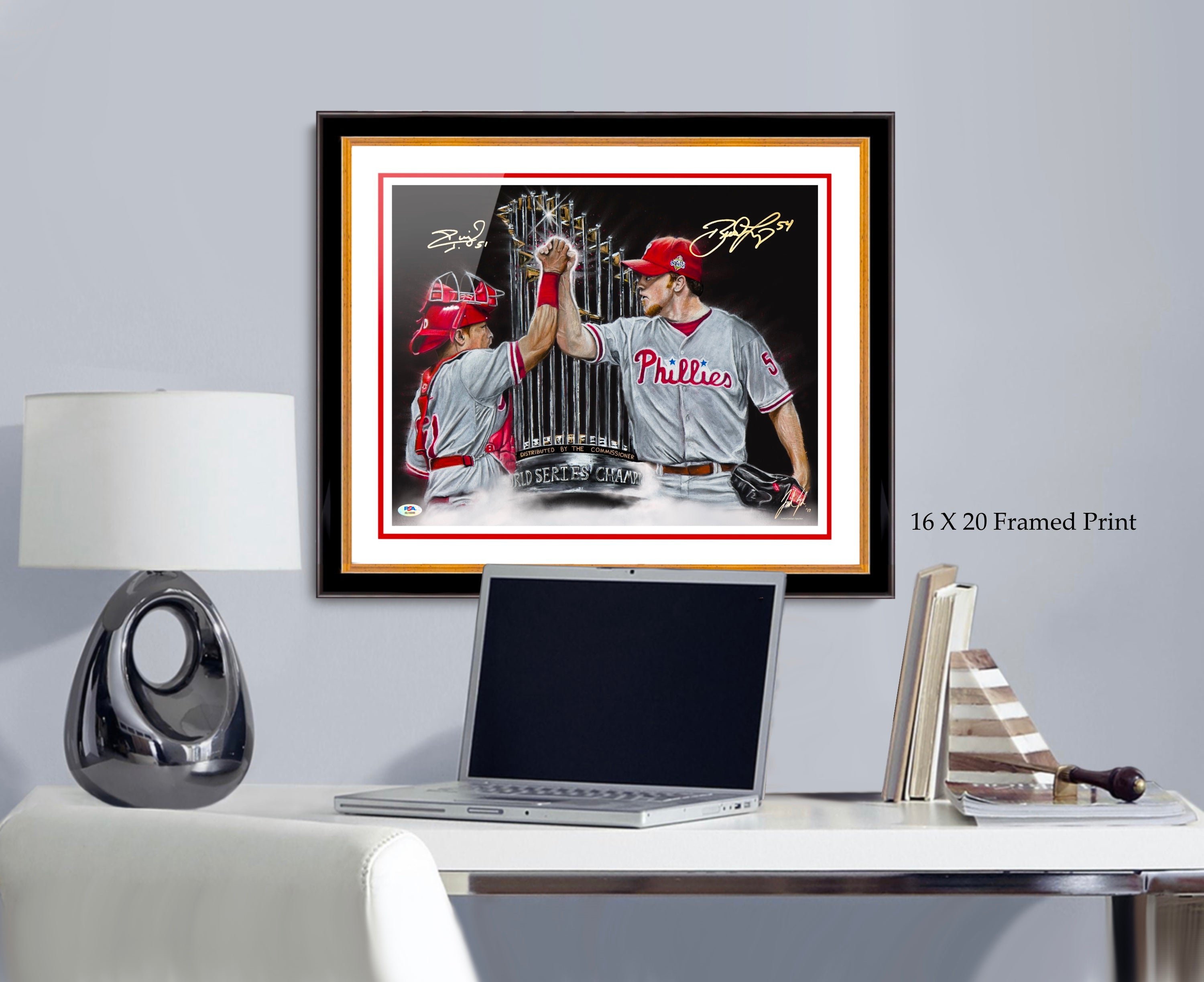 Each print includes an autograph from Brad Lidge, Carlos Ruiz, artist Jordan Spector, and a PSA certificate of authenticity.