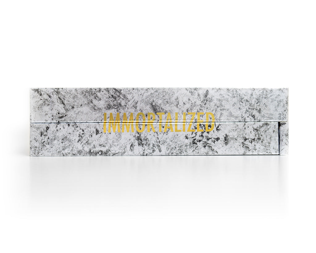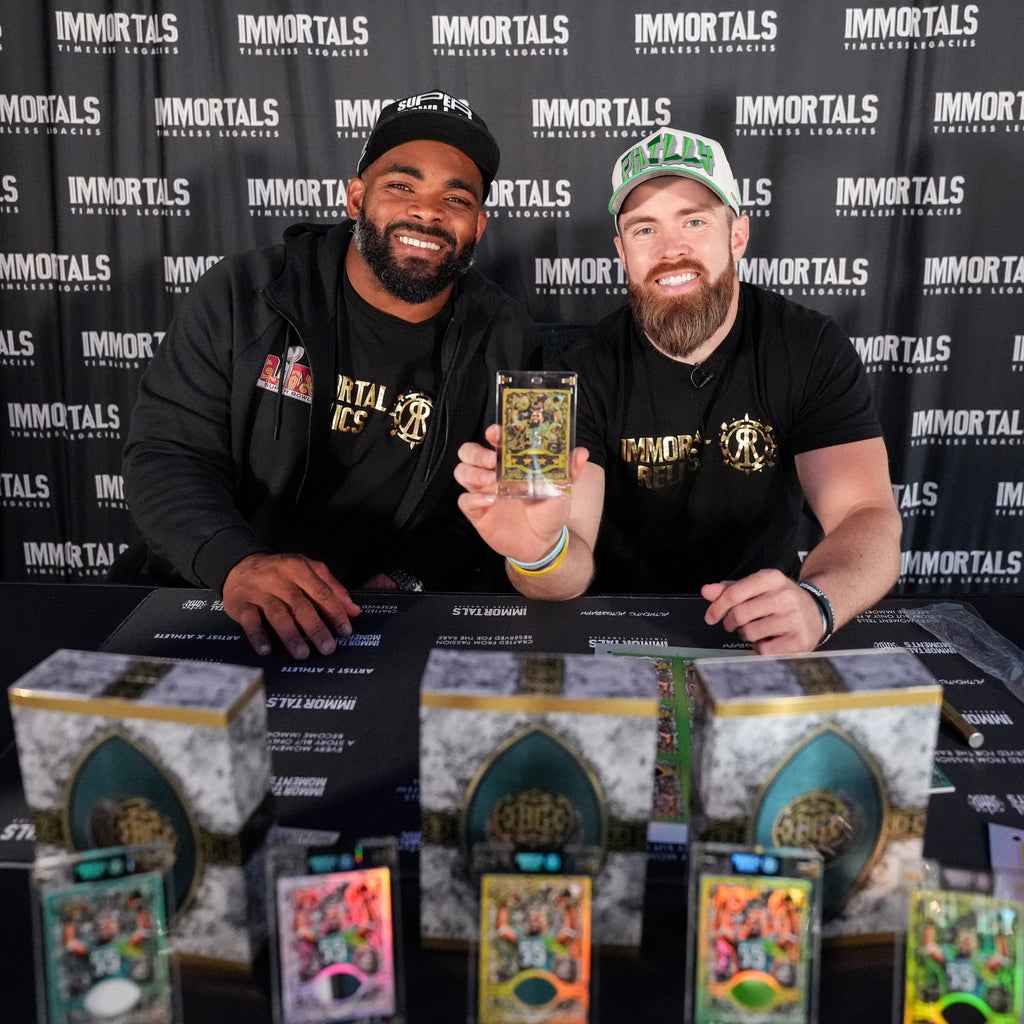 After months of design and countless iterations, the Immortals Paragon Case was born. This treasure-chest–style box (5.5" × 7.5") is where the experience begins. Every functional detail is intentional: the exterior and interior are wrapped in spot foil, layered with quotes, fine details, and BG-specific Immortal Relic marks. Slide off the football relic sleeve to reveal the Paragon lift mechanism, your gateway to the collection within.