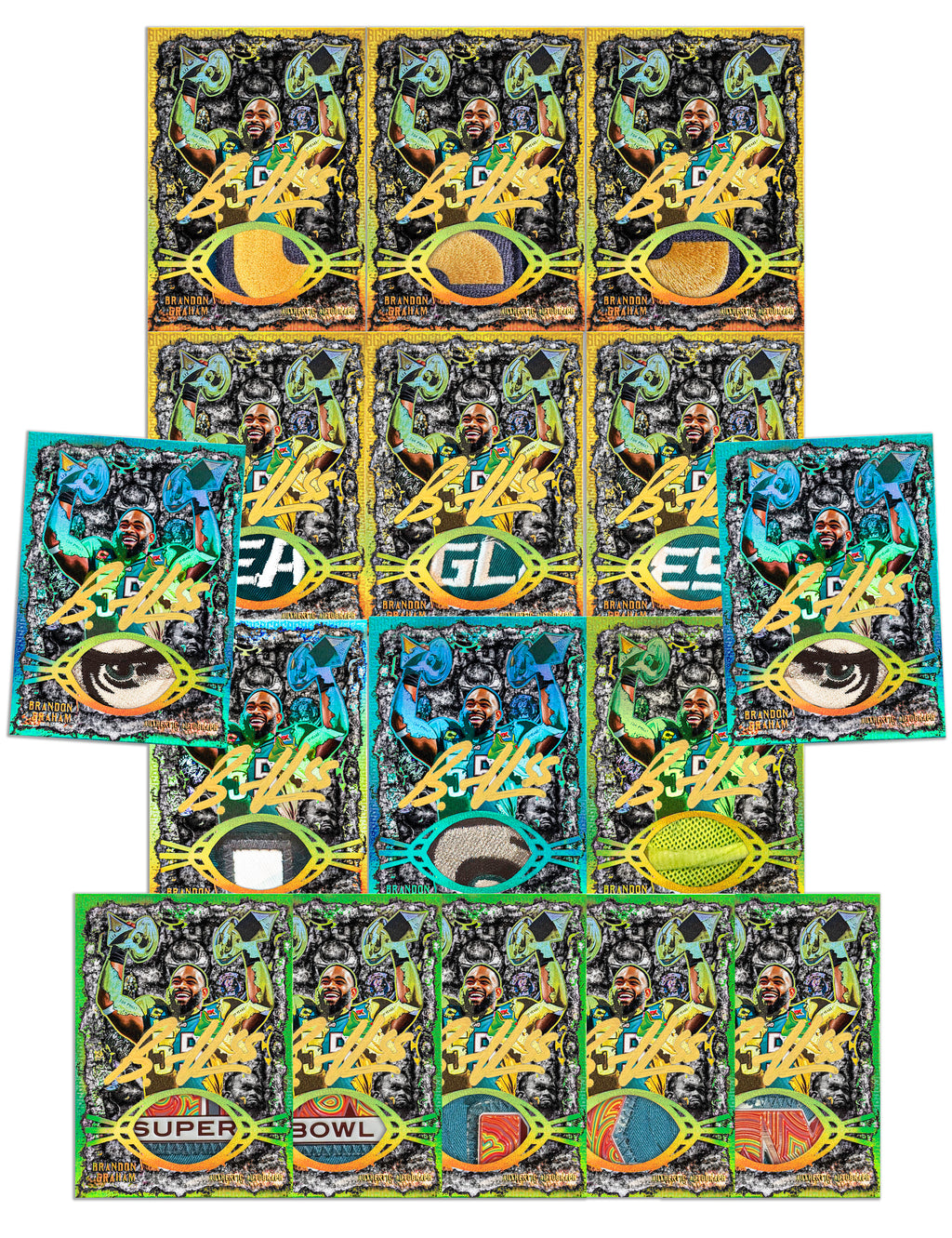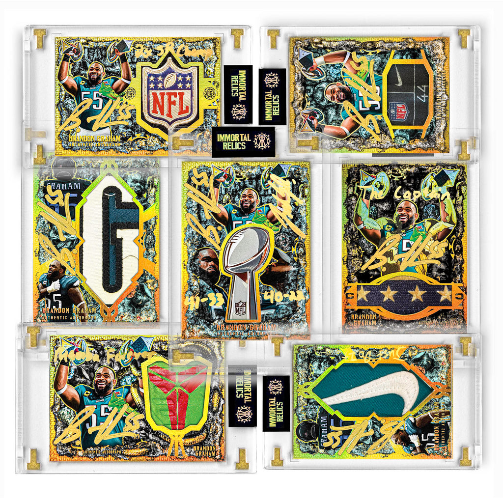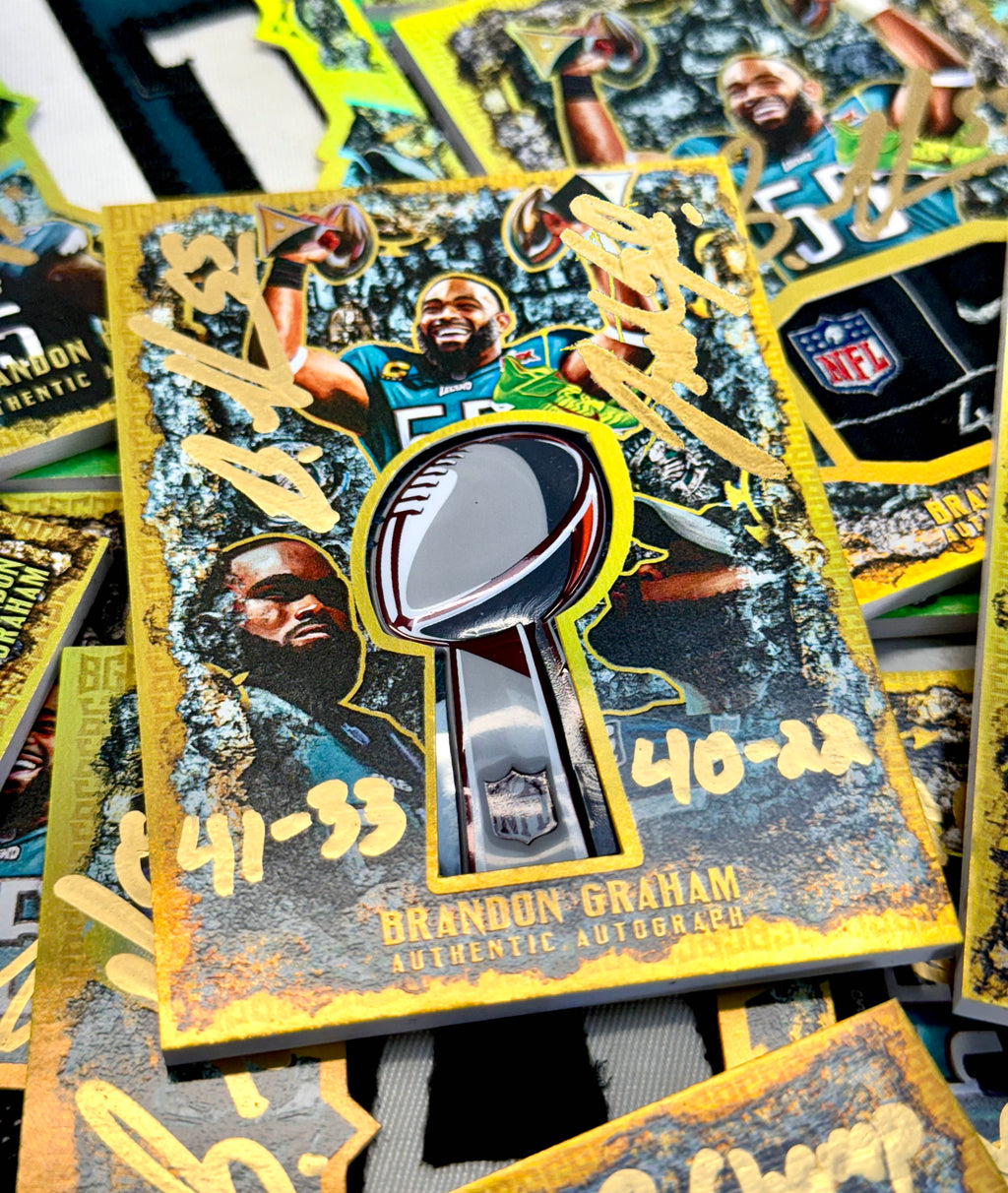 Every detail was designed with intention to create an experience that lasts: from the premium box to the exclusive gold All-Touch case to the cards themselves. Each card includes a piece of Brandon Graham’s game-worn LIX jersey and/or cleats. Explore 9 distinct relic die-cuts, 27 design iterations, and 200+ authentic autographs - including 15 special inscriptions. And if fortune smiles, you might pull one of the 8 one-of-one cards.