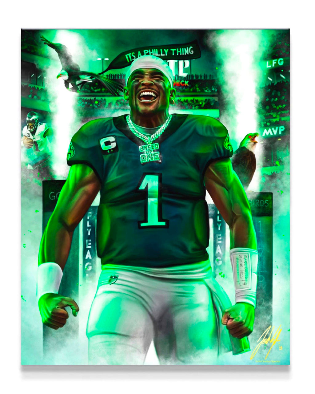 Look closely, every piece I create includes many references and details. Some more obvious than others. In Breed of One you will find the words "Go Birds", "MVP", "LFG", a bald eagle flying with a banner that reads "It’s a Philly thing", Jalen Hurts popular blinged out chain "Breed of one" and lastly 4 numbers on the pillar behind Jalen Hurts left arm reading "12, 5, 7, 1" all representing Philadelphia’s rich history of successful African American quarterbacks.