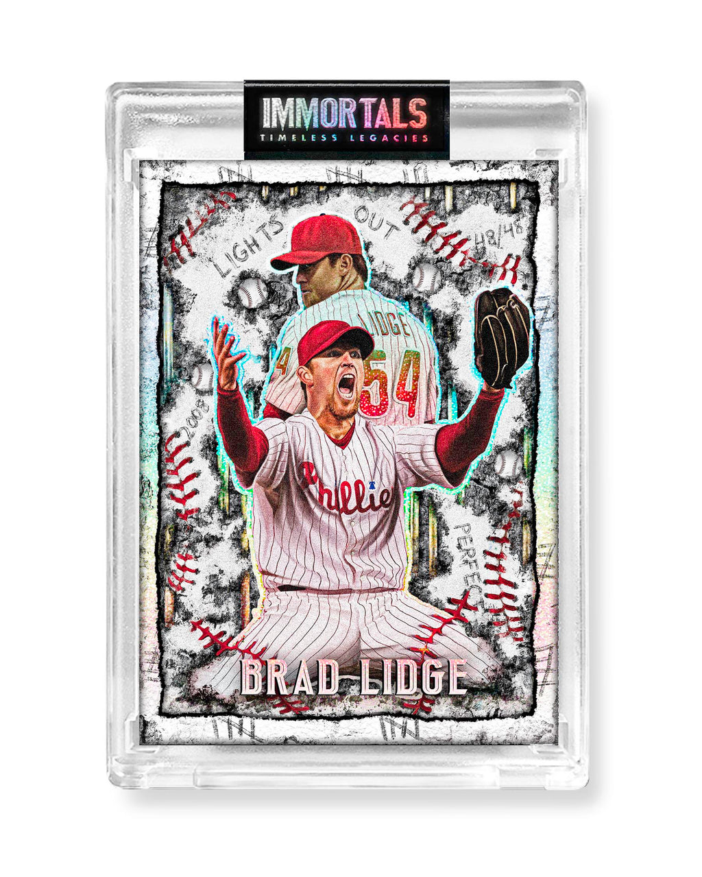 This design pays homage to Lidge’s incredible season while embracing his post-MLB passion for archaeology. Each element has an intentional, ancient feel, turning every piece into a timeless artifact. It’s fitting that the project includes our first relic cards, as Lidge himself now digs for artifacts in his archaeology career. Brad Lidge earned his Masters in Ancient Roman Archeology from the university of Leicester in 2017. Now, Lidge is currently pursuing his doctoral degree in the same field.