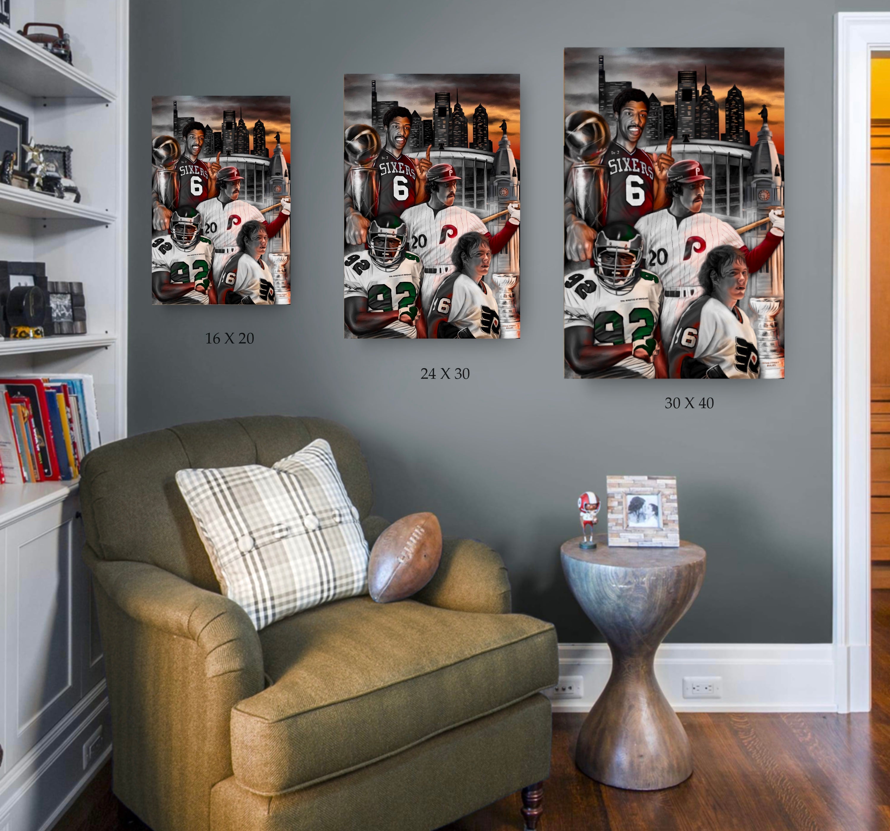 They say never forget where you came from. In Philly, this is where we come from. A place of grit, toughness, and a winning mentality. Philly sports has a rich history and some of the greats have and always will pave the way. A one-of-a-kind piece "Broad Street Boys" represents some of our favorite vintage athletes including Dr. J, Mike Schmidt, Reggie White and Bobby Clarke. Look closely and relive history with every hand drawn detail. From the vet to the new Philly skyline we can never forget our pastime greats.