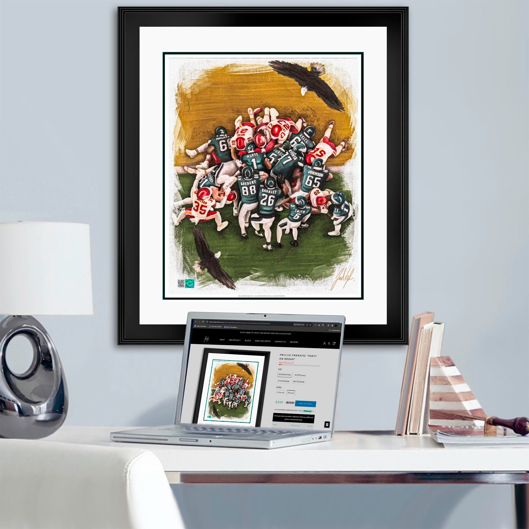 This painting captures that essence—an aerial view of chaos and control, strength and unity. Midnight green surges forward, crimson red resists, and at the center, Kelce leads the charge one final time. Overhead, eagles soar above the fray, symbolic of Philadelphia’s relentless spirit and the legacy this play leaves behind.