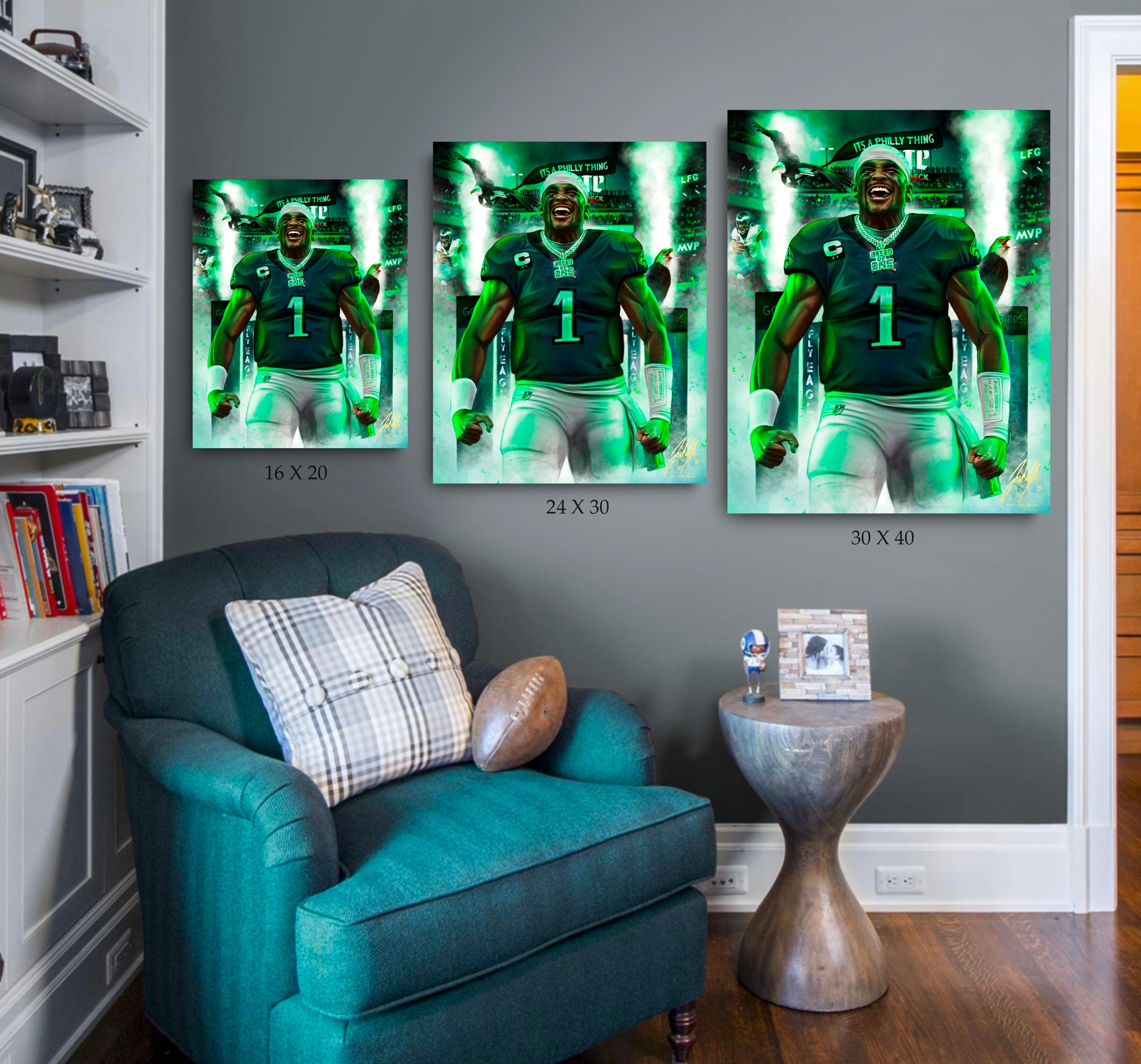 Breed of one, a motto fitting for a player that has proven why he is so unique. Since being drafted by the Philadelphia Eagles very few believed in Jalen Hurts ability to become Philadelphia’s franchise quarterback. I think it’s safe to say now that they were wrong. However, no one could have predicted Hurts becoming this dominant this quickly. Jalen Hurts accomplishments are a testament to what he lives and breathes, hard work. A relentless gym rat, Hurts has shown more improvement in just two years than most players show in their entire career. The leadership, passion, energy, and focus Hurts brings to the Philadelphia Eagles is unmatched. His story and rise to the occasion, the Eagles 2023 MVP, an NFC championship title, and a trip to Super Bowl LVII inspired me to create this.