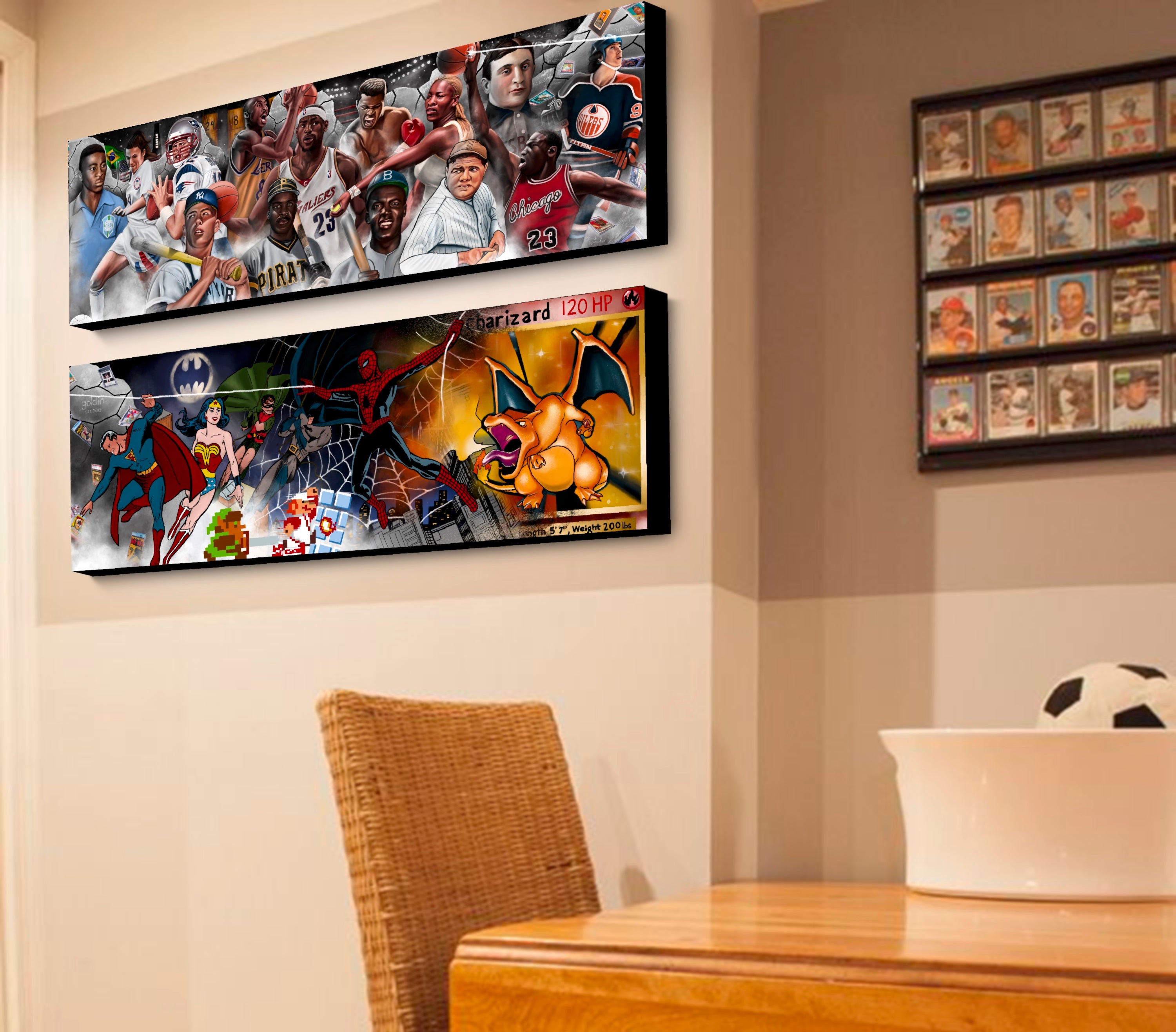 Legends Row was originally created and installed as a 10 x 60 foot mural for Goldin Co at their headquarters in Runnemede, NJ in January 2022.Collectors from all over the world can appreciate this. If you are in the hobby you know the value these iconic images, cards, comics and collectibles have garnered over the years. From left to right 22 characters complete the walls. This includes Pele, Mia Hamm, Tom Brady, Micky Mantle, Kobe Bryant, Lebron James, Barry Bonds, Muhammad Ali, Serena Williams, Babe Ruth, Jackie Robison, Michael Jordan, Honus Wagner, Wayne Gretzky, the original Superman, original Wonder Woman, original Batman & Robin, original Zelda, original Mario, original Spider-Man and the greatest Pokémon of them all, Charizard. There is nothing out there quite like this. A true piece of collectibles history.