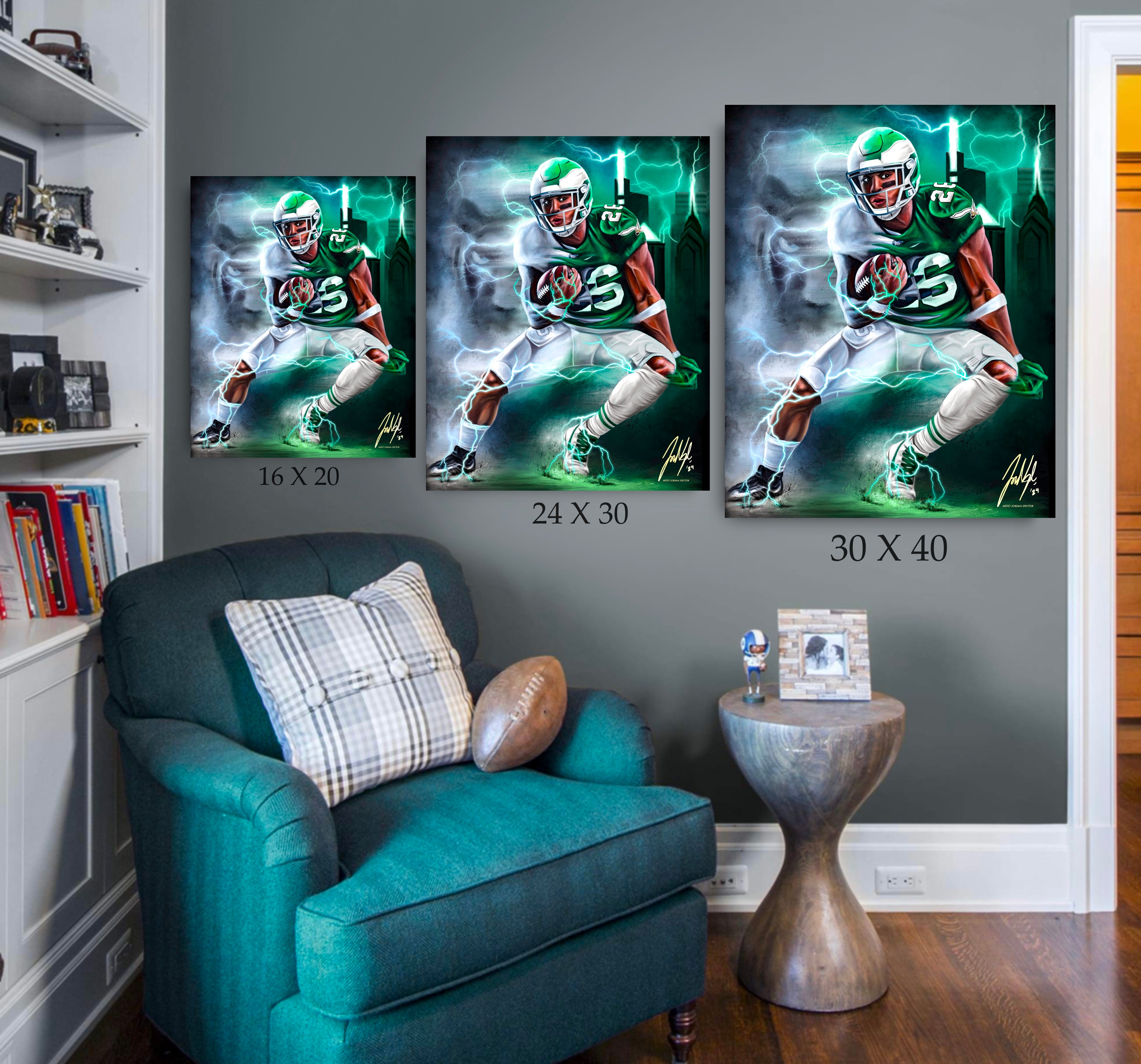 If you look closely, you’ll discover many fun details. For this piece, I wanted to include the journey from Saquon's time as a Penn State Nittany Lion to now as an Eagle. In the background on the left, you’ll find a lion hiding in the smoke, followed by Saquon in his all-white Penn State uniform. With the new additions, this piece now has Saquon in the Kelly Green uniform with the Philadelphia skyline. Saquon is captured performing his signature juke. Lastly, to tie it all together is the electricity throughout, representing the energy Saquon brings to the field.
